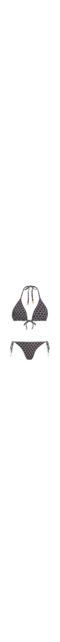 O biquíni preto é confeccionado em malha com alta elasticidade. O top de modelo triângulo possui alças finas com aplicações de esferas em papel na cor bege nas ponteiras, laterais finas, estampa geométrica na cor bege, dupla face bege e fechamento posterior por amarração. A calcinha de modelo tanga possui laterais finas com aplicações nas ponteiras de esferas em papel na cor bege, estampa geométrica na cor bege, estampa geométrica na cor bege, dupla face bege e fechamento lateral por amarração.