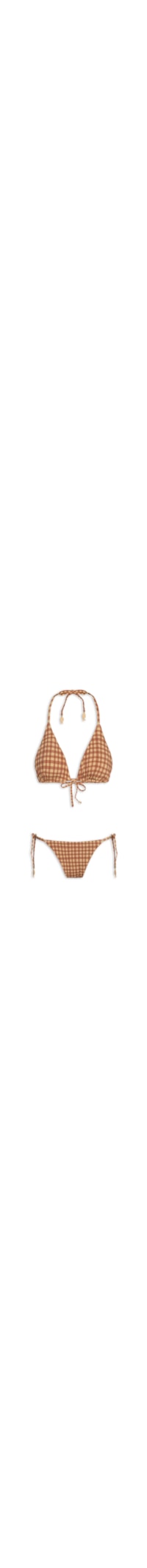 O biquíni marrom é confeccionado em malha de poliamida com alta elasticidade. O top de modelo cortininha dupla face possui decote V, alças finas com amarração no pescoço e miçangas aplicadas, forro, estampa geométrica na cor bege e fechamento posterior por amarração. A calcinha de modelo string dupla face possui laterais finas, forro, estampa xadrez de cores contrastantes e fechamento por amarração lateral por cordões com miçangas aplicadas em formato de peixe.