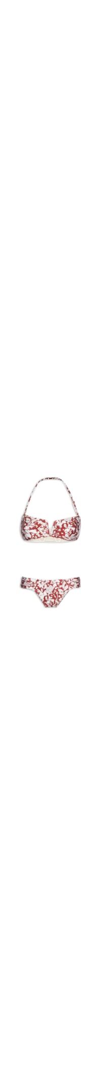 O biquíni vermelho é confeccionado em malha de poliamida com alta elasticidade. O top justo ao corpo possui decote coração com abertura em v com metal embutido, alças finas removíveis com regulagem, parte posterior em trama em cor contrastante, bojo removível, estampa floral em cores contrastantes. A calcinha justa ao corpo possui laterais médias com efeito franzido, forro, e estampa abstrata em cores contrastantes.