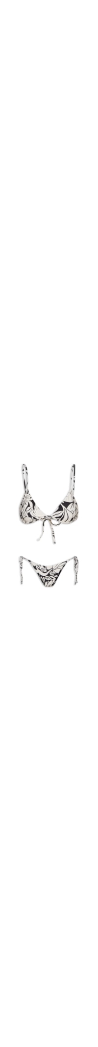 O biquíni preto é confeccionado em malha de poliamida com média elasticidade. O top de modelo cortininha possui alças finas e alongadas para amarração, mix de estampas figurativas em tom contrastante, forro, sem bojo e fechamento posterior em amarração. A calcinha de modelo tanga possui cintura baixa, laterais em tiras finas e alongadas para amarração, mix de estampas figurativas em tom contrastante, forro e acabamento elástico.