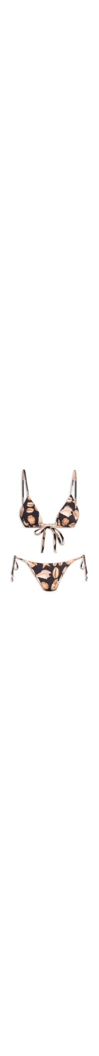 O biquíni preto é confeccionado em malha de poliamida com alta elasticidade. O top de modelo dupla face possui alças finas com regulagem, busto com modelagem triangular, estampa figurativa em cores contrastantes, forro e fechamento posterior por amarração. A calcinha de modelo dupla face possui cintura baixa, laterais finas com amarração e aplicação de ponteiras metálicas, estampa figurativa em cores contrastantes e forro. A outra face possui cor bege e estampa figurativa em cores contrastantes.