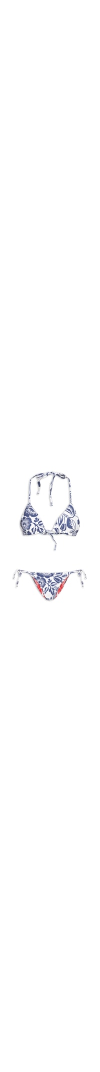 O biquíni azul é confeccionado em malha de poliamida com alta elasticidade. O top de modelo dupla face possui alças finas alongadas, estampa figurativa em cor contrastante, forro e fechamento posterior por tiras alongadas para amarração. A outra face possui cor vermelha. A calcinha de modelo dupla face possui cintura baixa, estampa figurativa em cor contrastante, forro e laterais com tiras alongadas para amarração com ponteiras figurativas florais. A outra face possui cor vermelha.