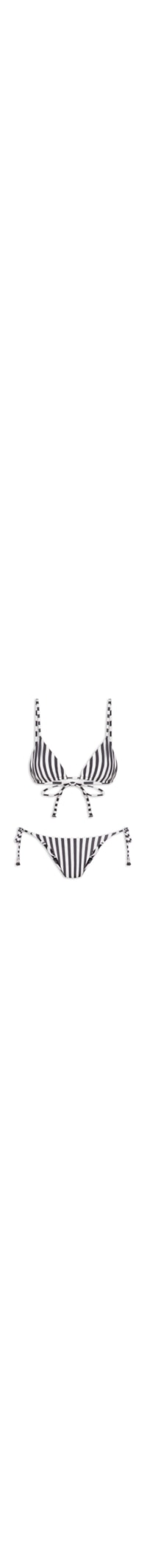 O biquíni preto é confeccionado em malha de poliamida com média elasticidade. O top de modelo dupla face possui alças finas, padronagem figurativa em cor contrastante, forro e fechamento posterior por amarração. A calcinha de modelo dupla face possui cintura baixa, laterais finas com amarração, forro interno e padronagem figurativa em cor contrastante. A outra face possui cor preta com padronagem em cor contrastante.