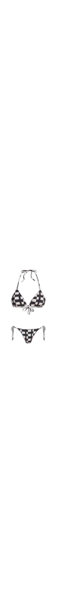 O biquíni preto é confeccionado em malha leve com média elasticidade. O top de modelo cortininha possui alças finas reguláveis por amarração posterior, forro com estampa geométrica em cores contrastantes, estampa geométrica e fechamento posterior por amarração. A calcinha de modelo tanga possui laterais finas ajustáveis por amarração, estampa geométrica e forro com estampa geométrica em cores contrastantes.