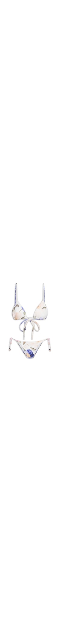 O biquíni branco é confeccionado em malha de poliamida com média elasticidade. O top possui decote triângulo, alças finas com regulagem, laterais finas, estampa figurativa em cores contrastantes, forro e fechamento por amarração nas costas. A calcinha possui cintura baixa, laterais finas para amarração, estampa figurativa em cores contrastantes e forro.