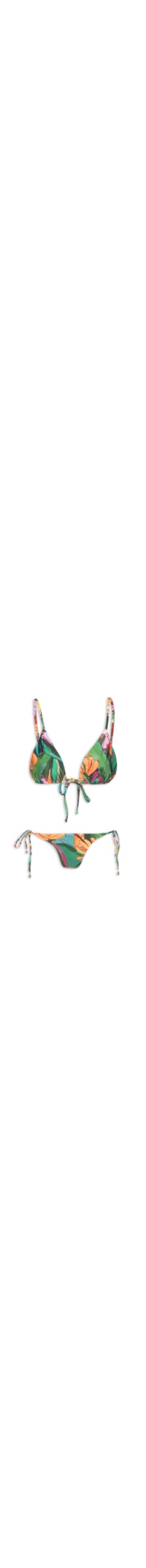 O biquíni verde é confeccionado em malha com alta elasticidade. O top de modelo triângulo possui alças finas, sem bojo, laterais finas, mix de estampas em cores contrastantes e fechamento posterior por amarração. A calcinha de modelo tanga possui laterais finas, forro, mix de estampas em cores contrastantes e fechamento lateral por amarração.