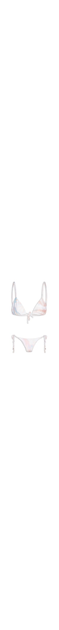 O biquíni rosa é confeccionado em malha de poliamida com baixa elasticidade. O top de modelo cortininha possui alças finas, laterais finas, padronagem abstrata em cores contrastantes, forro e fechamento posterior por amarração. A calcinha possui cintura baixa, laterais finas, padronagem abstrata em cores contrastantes, forro e fechamento lateral por amarração.