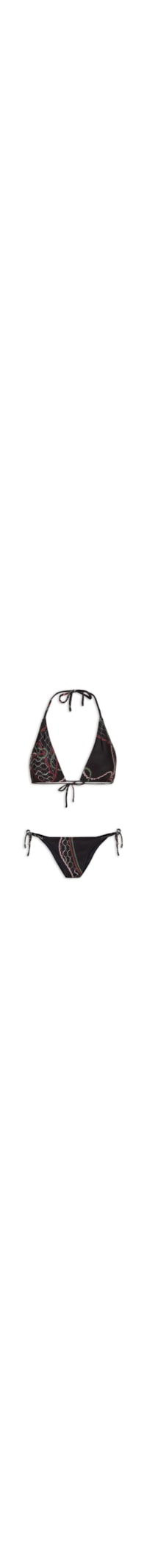 O biquíni preto é confeccionado em malha de poliamida com alta elasticidade. O top modelo cortininha possui decote V, alças finas reguláveis, estampa figurativa de cordas e cores contrastantes, forro e fechamento posterior por amarração. A calcinha de modelo string possui estampa figurativa de cordas e cores contrastantes, laterais finas com fechamento por amarração e forro.