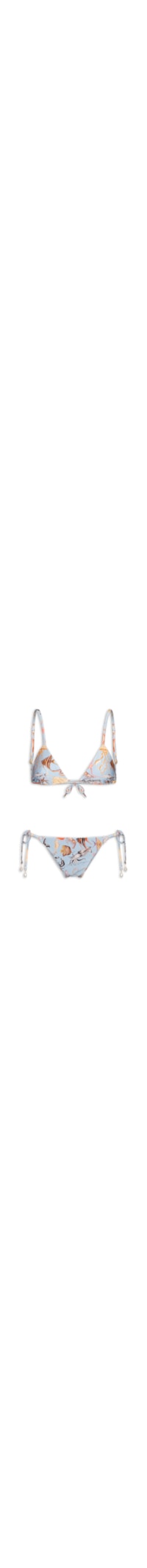 O biquíni azul é confeccionado em malha de poliamida com alta elasticidade. O top possui alças finas reguláveis, estampa figurativa com em cores contrastantes, forro e fechamento posterior por amarração. A calcinha possui cintura baixa, laterais finas ajustáveis por amarração, aplicação de ponteiras com miçangas nas extremidades, estampa figurativa em cores contrastantes e forro.