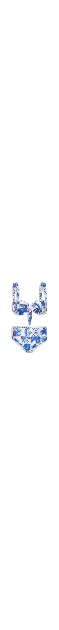 O biquíni azul é confeccionado em malha leve com alta elasticidade. O top de modelo meia taça possui decote coração com bordado em cor contrastante e aplicação de miçangas, alças médias, busto com recortes e aros embutidos, forro, estampa floral em cor contrastante e fechamento posterior por amarração. A calcinha de modelo hot pant* possui laterais largas, cavas estendidas, forro e estampa floral em cor contrastante.