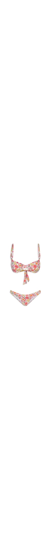 O biquíni branco é confeccionado malha de poliamida com alta elasticidade. O top de modelo meia taça possui alças finas com regulagem, aro embutido na parte inferior do busto, mix de estampas em cores contrastantes, forro, e fechamento posterior por encaixe. A calcinha de modelo asa delta possui cintura alta, laterais médias, mix de estampas em cores contrastantes e forro.