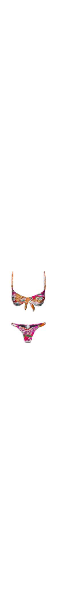 O biquíni rosa é confeccionado em malha cirrê com média elasticidade. O top de modelo meia taça possui decote V, alças finas reguláveis, recortes frontais, barbatana embutida para sustentação, estampa floral em tons contrastantes, forro, bojo removível e fechamento posterior em tira alongada para amarração. A calcinha de modelo fio dental possui cintura baixa, laterais médias com elástico embutido, cavas estendidas, estampa floral em tons contrastantes, forro e acabamento elástico.