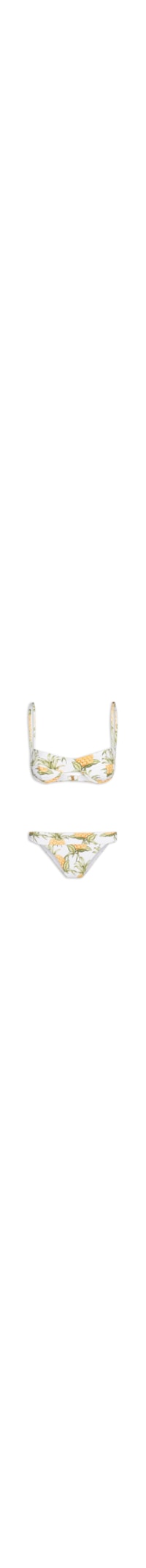 O biquíni branco é confeccionado em malha com superfície atoalhada de média elasticidade. O top possui decote meia taça, alças finas reguláveis, recorte frontal sobreposto, recortes frontais, aro embutido abaixo do busto, forro, sem bojo, estampa figurativa de abacaxi em cores contrastantes e fechamento posterior por encaixe metálico. A calcinha de modelo tanga possui cintura média, laterais largas, estampa figurativa de abacaxi em cores contrastantes e forro.