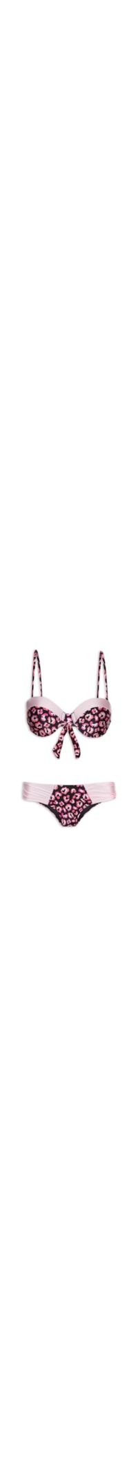 O biquíni rosa é confeccionado em malha de poliamida com média elasticidade. O top possui decote coração, alças finas reguláveis e removíveis, recorte frontal em cor contrastante, aro embutido abaixo do busto, estampa animal print em cores contrastantes, bojo fixo e fechamento posterior por tiras alongadas para amarração. A calcinha de modelo borboleta possui cintura baixa, laterais largas com efeito franzido e cor contrastante, estampa animal print em cores contrastantes e forro.