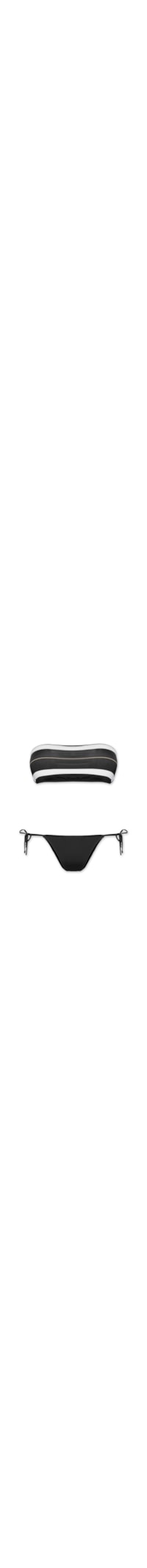 O biquíni preto é confeccionado em malha de poliamida com alta elasticidade. O top possui modelo tomara que caia, decote reto, bojo removível, detalhe de listras em cores contrastantes aplicadas na parte frontal e fechamento posterior por encaixe. A calcinha de modelo string possui laterais finas com fechamento por amarração e forro.