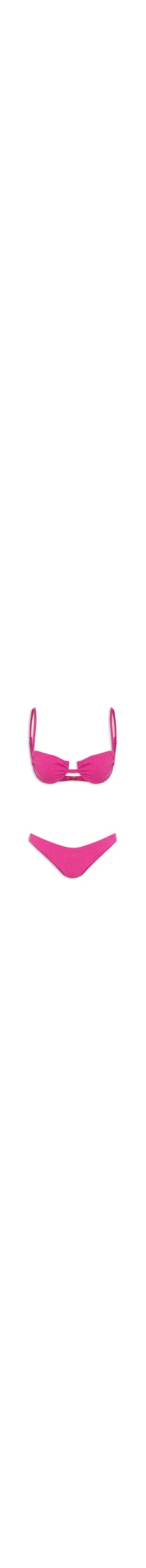 O biquíni rosa é confeccionado em malha de poliamida com alta elasticidade. O top de modelo meia taça possui alças finas reguláveis, aro de sustentação embutido, padronagem abstrata em alto-relevo, forro e fechamento posterior por encaixe metálico. A calcinha de modelo asa delta possui cintura baixa, laterais médias, padronagem abstrata em alto-relevo e forro.