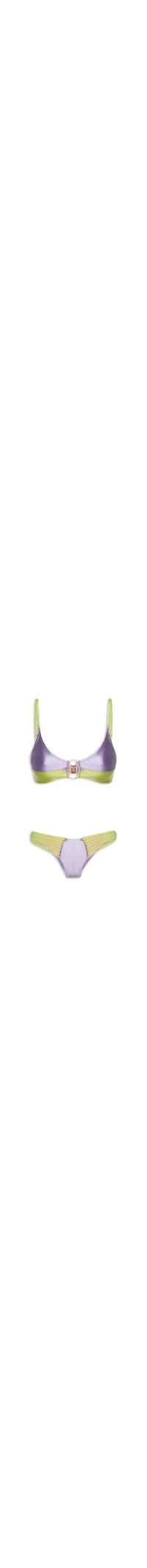 O biquíni lilas é confeccionado em malha cirrê. O top possui decote U, alças finas com regulagem, laterais médias, alças e recortes frontais em cor contrastante, recorte frontal vazado com aplicação de argolas metálicas, bojo, shape justo e fechamento posterior por colchete. A calcinha de modelo tanga possui laterais finas em cor contrastante com recortes vazados que se estendem a parte frontal e com argolas metálicas nas laterais, forro e shape justo.