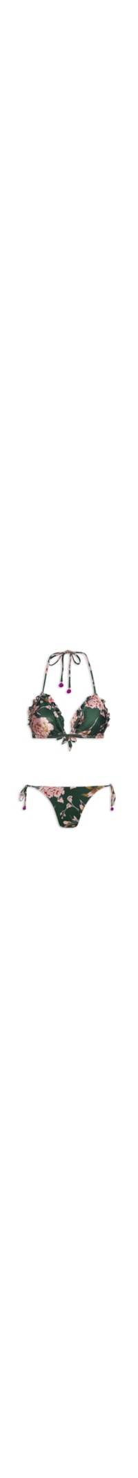 O biquíni verde é confeccionado por malha de poliamida com média elasticidade. O top de modelo cortininha possui decote V, alças finas estendidas para amarração, detalhes em babados, estampa figurativa floral em cores contrastantes, bojo embutido, forro e fechamento posterior por amarração. A calcinha possui alças laterais estendidas, estampas figurativas florais de cor contrastantes, forro e fechamento por amarração lateral.