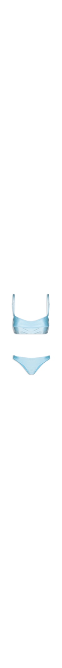 O biquíni azul é confeccionado em malha cirrê de média elasticidade. O top possui decote reto, alças finas reguláveis, recortes frontais, forro, sem bojo e fechamento posterior por aviamentos quadrados e metálicos para encaixe. A calcinha possui cintura baixa, laterais médias e tecido duplo.