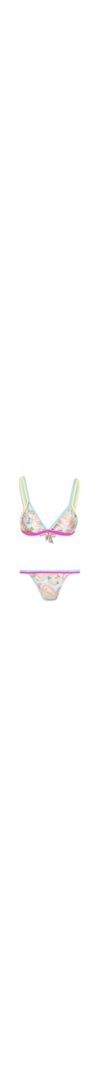 O biquíni azul é confeccionado por malha de poliamida com alta elasticidade. O top possui decote triangulo, bojo removível, alças duplas finas em cor contrastante e com efeito trançado, estampas abstratas em cores contrastantes, forro e fechamento por amarração posterior. A calcinha possui alças finas laterais com efeito trançado e em cores contrastante, detalhe franzido na parte posterior, forro e estampas abstratas em cores contrastantes.