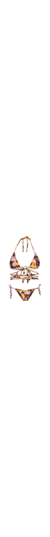 O maiô marrom é confeccionado em malha com alta elasticidade. O top de modelo triângulo possui alças e laterais finas alongadas, forro, bojo removível, mix de estampas em cores contrastantes, argola metálica aplicada na parte frontal, com faixas finas para amarração e fechamento posterior por amarração. A calcinha de modelo tanga possui laterais finas, forro, mix de estampas em cores contrastantes e fechamento lateral por amarração.