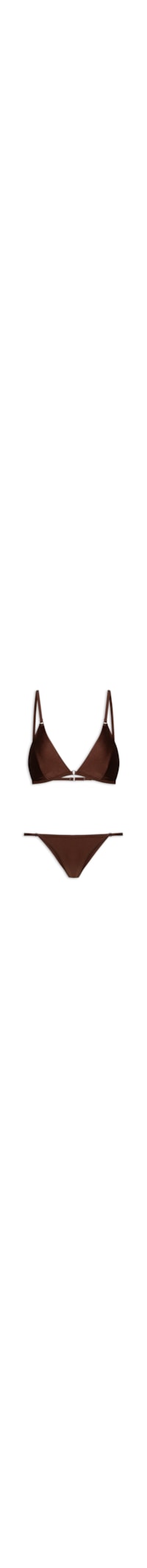 O biquíni marrom é confeccionado em malha cirrê de média elasticidade. O top possui decote em V, alças finas com regulagem, detalhe de argola metálica aplicada na parte frontal, bojo removível, forro e fechamento posterior por encaixe metálico. A calcinha de modelo string possui cintura baixa, laterais finas com regulagem e forro.