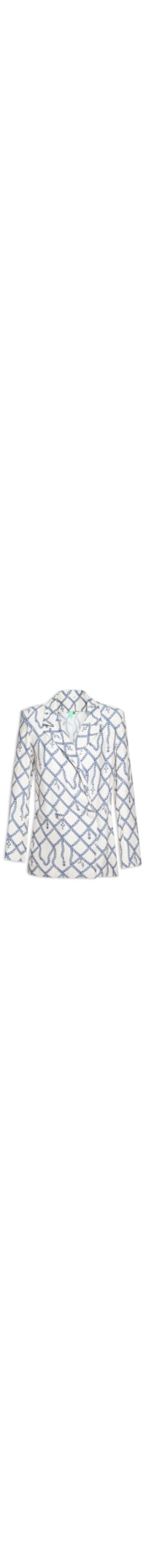 O blazer off white é confeccionado por tecido leve sem elasticidade. A peça solta ao corpo possui gola lapela, mangas longas, ombros levemente estendidos com ombreiras embutidas, estampas figurativas, fechamento por botão frontal e comprimento alongado.