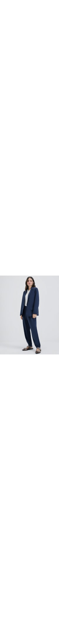 O blazer azul é confeccionado em tecido leve sem elasticidade. A peça solta ao corpo, possui decote em V profundo, lapela chanfrada, mangas longas com abotoamento nos punhos, bolsos frontais embutidos, comprimento longo, forro e fechamento frontal por botões.