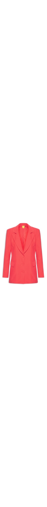 O blazer vermelho éconfeccionado em tecido leve sem elasticidade. A peça solta ao corpo possui lapela chanfrada, mangas longas, forro, ombreira, vistas sobrepostas na parte frontal, comprimento alongado e fechamento frontal por botões.
