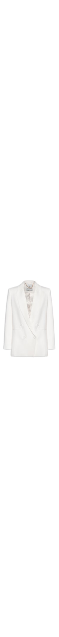 O blazer branco é confeccionado em tecido leve com toque de linho. A peça solta ao corpo possui lapela chanfrada, mangas longas com abotoamento, bolsos frontais embutidos, fenda posterior, forro e fechamento frontal por botões.