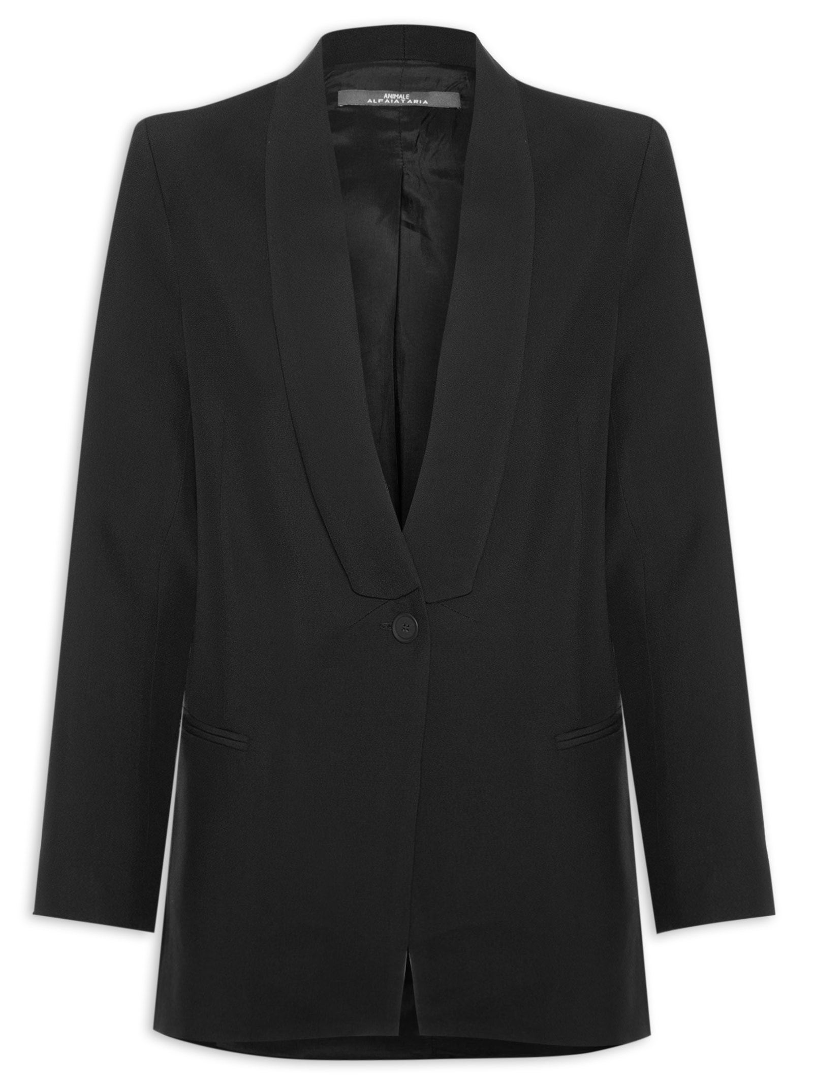 O blazer preto é confeccionado em crepe sem elasticidade. A peça solta ao corpo possui lapela chanfrada, mangas longas com abotoamento nos punhos, ombreira, recorte posterior com fendas, bolsos frontais decorativos, forro e fechamento frontal por botão.