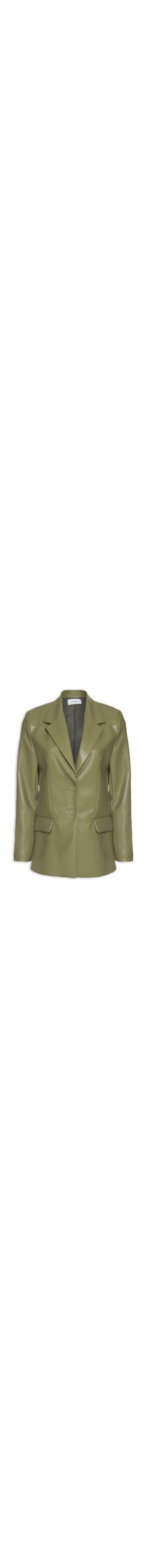 O blazer verde é confeccionado em material sintético. A peça possui lapela chanfrada, mangas longas com detalhe de prega e fenda nos punhos, ombreiras, bolsos frontais decorativo com aba sobreposta, recortes frontais e posteriores, shape solto, caimento reto, acabamento pespontado e fechamento frontal por botões.