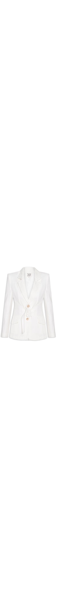 O blazer branco é confeccionado em linho sem elasticidade. A peça solta ao corpo possui lapela chanfrada, mangas longas, ombreira, recortes posteriores, prega posterior, pences frontais, bolsos frontais com fechamento por aba, forro, faixa alongada na parte frontal regulável por fivela e fechamento frontal por botões.