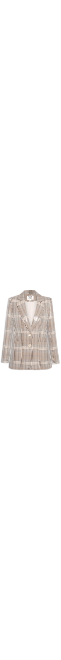 O blazer bege é confeccionado em tecido leve com superfície texturizada em paetê e sem elasticidade. A peça solta ao corpo possui lapela chanfrada, mangas longas, ombreira, recorte posterior, pences frontais, bolsos frontais, forro, padronagem xadrez em cores contrastantes e fechamento frontal por botões.
