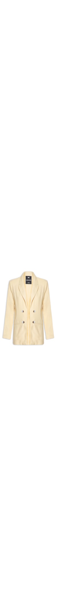 O blazer amarelo é confeccionado em tecido encorpado com toque de linho sem elasticidade. A peça solta no corpo possui lapela chanfrada, ombreiras embutidas, mangas longas, bolsos frontais, recortes frontais e posteriores, botões decorativos aplicados na parte frontal, forro e comprimento alongado.