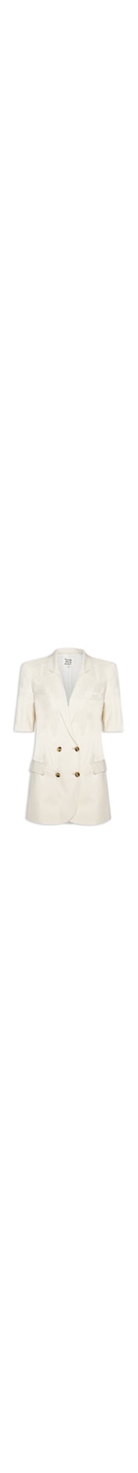 O blazer bege é confeccionado em tecido leve sem elasticidade. A peça solta ao corpo possui lapela chanfrada, mangas curtas, ombreiras embutidas, bolsos frontais com fechamento por aba sobreposta, fenda posterior, forro e fechamento frontal por botões.
