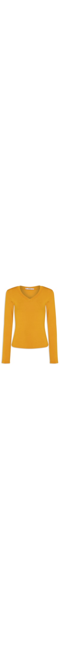 A blusa amarela é confeccionada em malha. A peça de modelo baby look possui decote v, mangas longas, shape solto, caimento reto e acabamento pespontado.