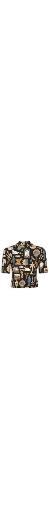 A blusa preta é confeccionada em malha de média elasticidade. A peça justa ao corpo possui gola alta, mangas curtas, mix de estampas em cores contrastantes, comprimento cropped e fechamento posterior por botões aplicados em recorte vazado.