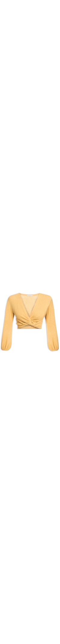 A blusa amarela é confeccionada em malha leve com toque de linho. A peça possui decote em V transpassado com detalhe frontal torcido, mangas longas levemente bufantes com elástico aplicado nos punhos, detalhe de pequenos recortes vazados, comprimento cropped e acabamento pespontado.