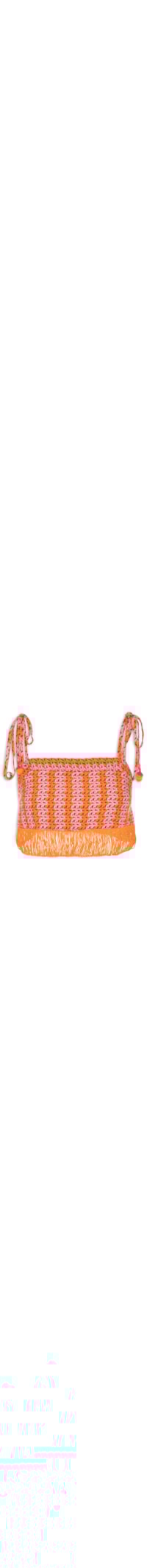 A blusa laranja é confeccionada em tecido leve. A peça possui decote quadrado, alças finas com ponteiras esféricas em crochê para ajuste, mix de estampas em cores contrastantes, detalhe de franjas na barra,comprimento cropped*, shape solto, caimento reto, acabamento pespontado e fechamento posterior por botão.