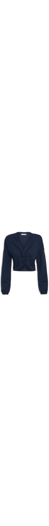 A blusa azul é confeccionada em malha com superfície texturizada. A peça possui decote V, detalhe em nó frontal, mangas longas com elástico nos punhos, comprimento cropped e acabamento pespontado.