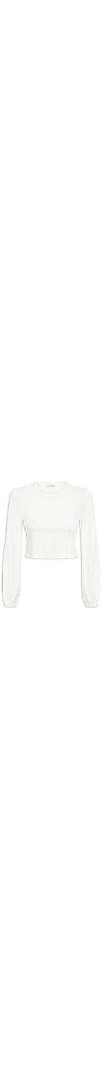 A blusa branca é confeccionada em tecido leve. A peça possui caimento reto, decote redondo, mangas longas bufantes com elástico nos punhos e comprimento cropped.
