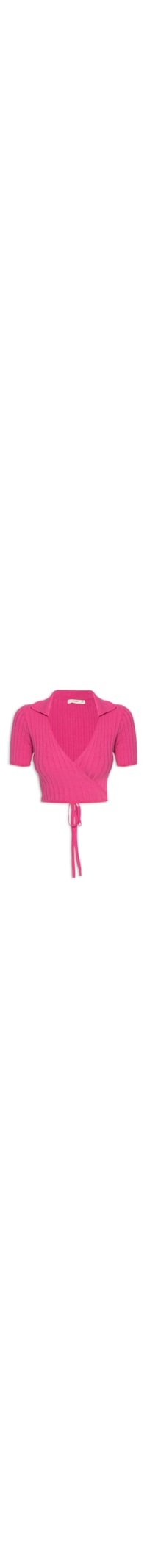 A blusa rosa é confeccionada em tricot. A peça possui decote V transpassado, colarinho simples, mangas curtas, shape justo, caimento reto, comprimento cropped*, faixas alongadas na altura da barra para amarração e acabamento canelado.
