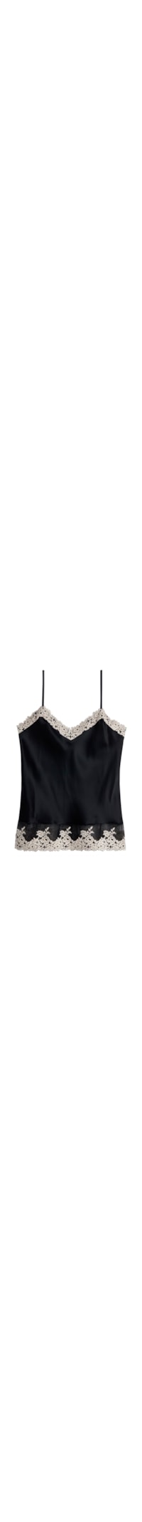 Selecione o tamanhoBlusa em cetim de seda com decote em V também na parte de trás, enriquecida por aplicações de renda bicolor no decote e na bainha. As alças são finas e reguláveis.