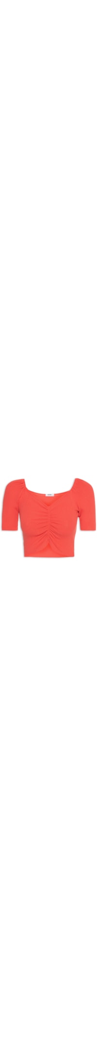 A blusa laranja é confeccionada em malha canelada. A peça possui decote v, mangas curtas, detalhe franzido na parte frontal, comprimento cropped, shape justo, caimento reto e acabamento canelado.