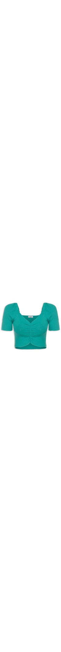 A blusa verde é confeccionada em malha canelada. A peça possui decote v, mangas curtas, detalhe franzido na parte frontal, comprimento cropped, shape justo, caimento reto e acabamento canelado.