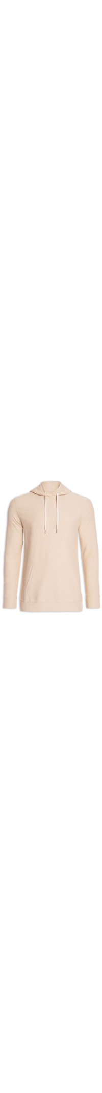 A blusa bege é confeccionada em sarja com toque de linho. A peça possui capuz com cordão embutido para ajuste, mangas longas com ajuste nos punhos, bolso frontal modelo canguru, tag da marca aplicada na parte frontal na altura da barra, shape solto, caimento reto e acabamento pespontado.