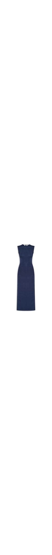 A blusa azul é confeccionada em tecido leve com alta elasticidade. A peça justa no corpo possui decote fechado, alças largas, cavas regulares, recorte posterior vazado, comprimento longo, fenda lateral alongada e fechamento posterior por amarração.