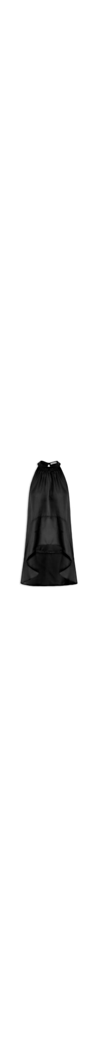 A blusa preto é confeccionada em tecido leve sem elasticidade. A peça solta ao corpo possui decote halter, cavas estendidas, recorte frontal e posterior, leve transparência, barra mullet* arredondada e fechamento posterior por botão na altura da nuca.