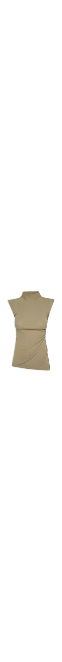 A blusa verde é confeccionada em tricot com superfície canelada e média elasticidade. A peça justa ao corpo possui gola alta, ombros estendidos, fenda com efeito franzido na lateral e comprimento alongado.